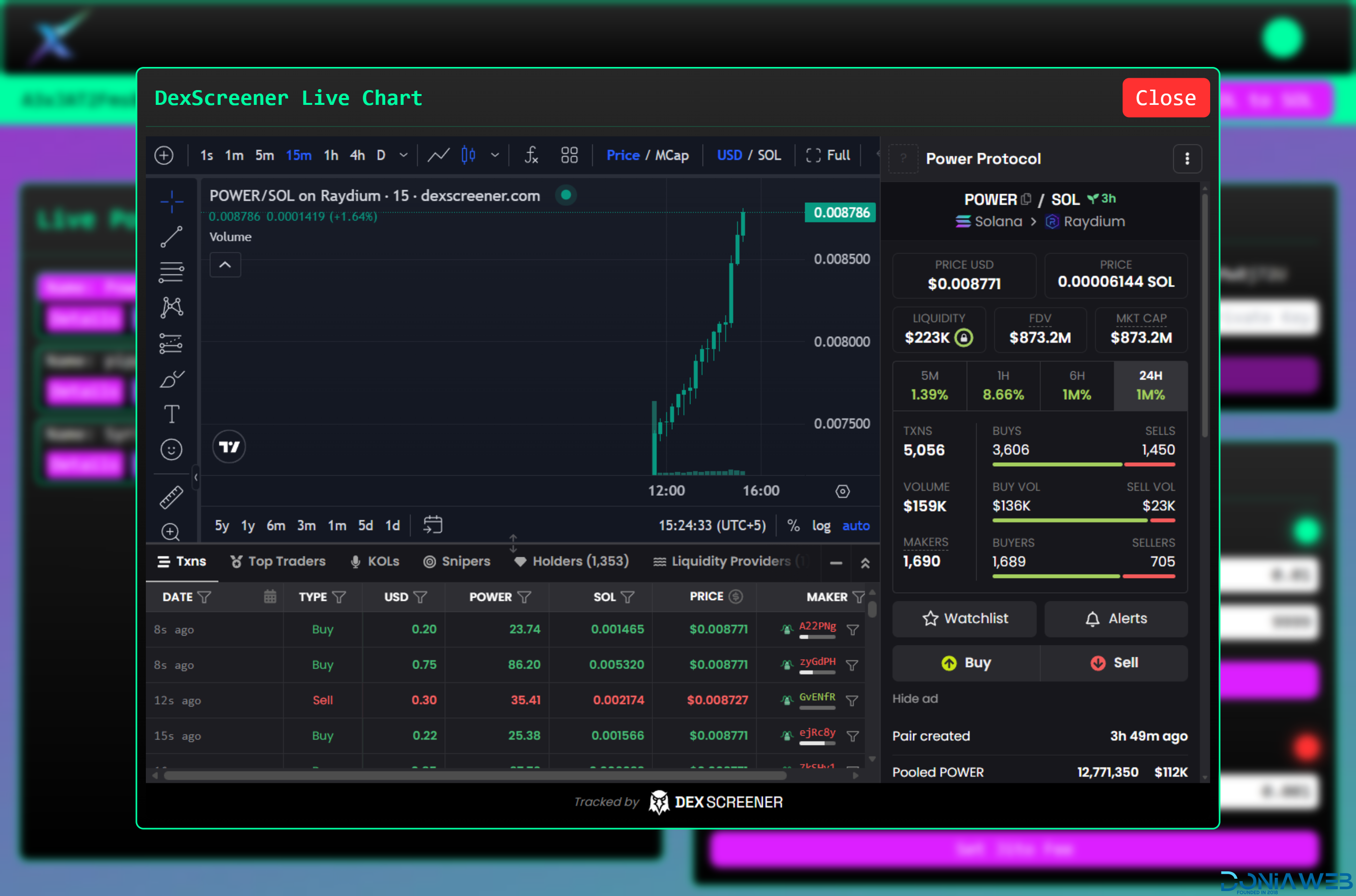 In-App Live Charting (DexScreener Modal): Analyze tokens without ever leaving the dashboard! A single click now opens a live DexScreener chart directly inside the app. No more tab switching.