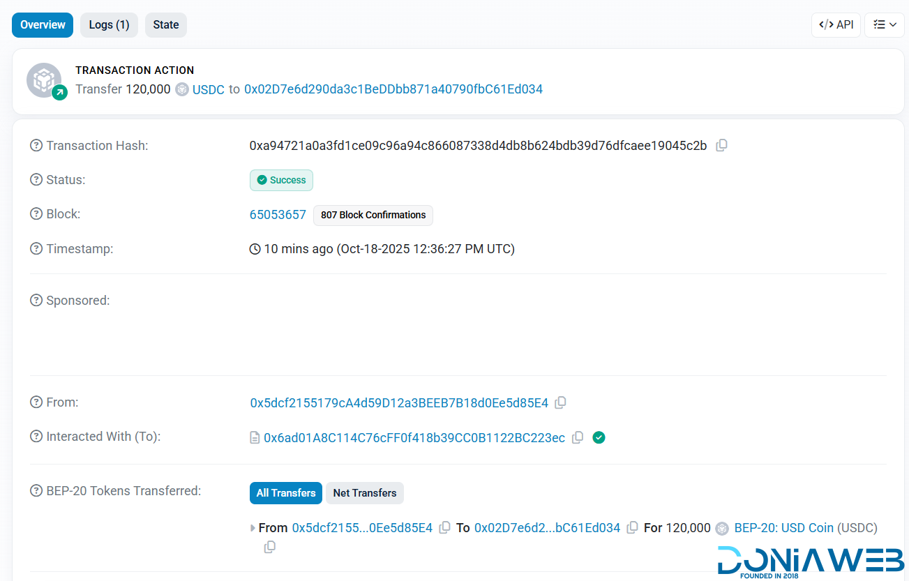 120K USDC Transfer: https://bscscan.com/tx/0xa94721a0a3fd1ce09c96a94c866087338d4db8b624bdb39d76dfcaee19045c2b