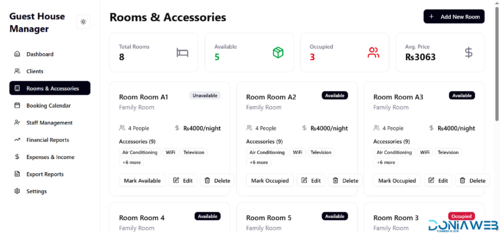 Rooms & Accessories: Add, edit, and organize rooms with all necessary details.