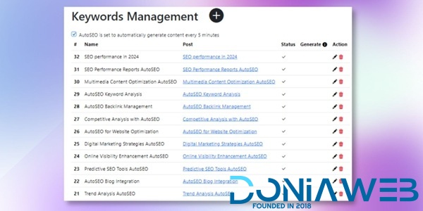 Upload keywords and set prompts to generate optimized blog entries. AutoSEO transforms your content strategy with automatic, high-quality generation, saving you time and effort.